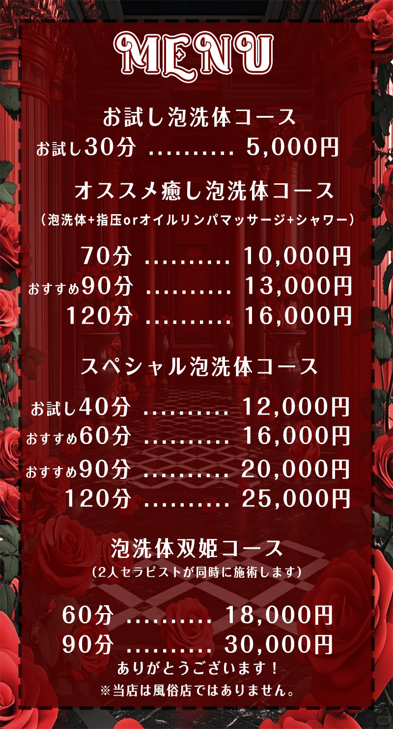 毎日頑張っている紳士の皆様、日頃の疲れになっている身体と心を、幸福なる雰囲気包まれた癒しの場所、落ちついた部屋の個室で可愛いセラピスト達がお待ちしております。当店のセラピストは若く容姿端麗にこだわりました、まるで蜜のように甘く幸せな空間でゆったりとした時間をお過ごし下さい。